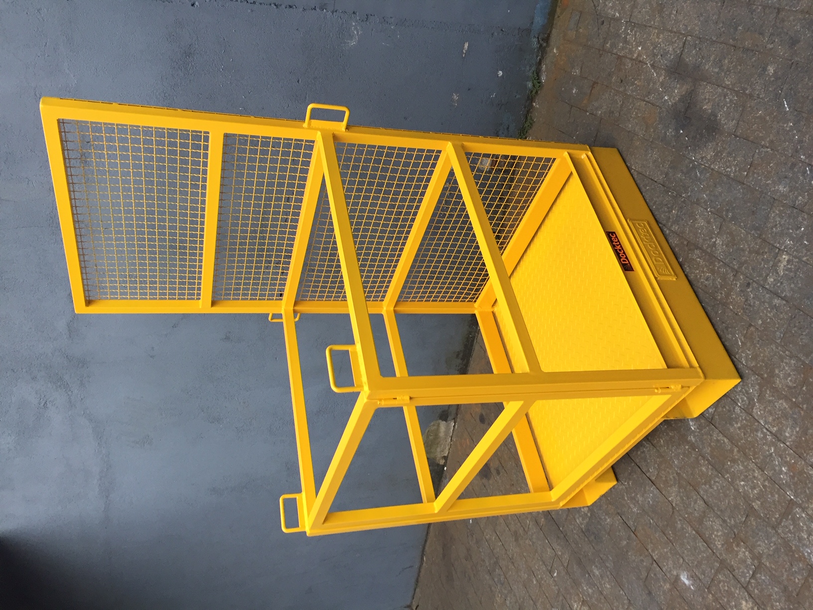 Para utilização sobre os garfos da empilhadeira, para manutenção em altura. | Capacidade de Carga distribuída de 250 kgf. | Construído em tubos e perfis de aço soldados e com tela para proteção na parte traseira | Dimensões: base com 1000x1000mm, guarda-corpo com 1100 mm e altura total de 1800 mm | Portinhola pivotada para facilitar o acesso do operador | Ancoramento para o cinto de segurança | Corrente para a fixação de segurança na torre da empilhadeira | Pintura em esmalte sintético na cor amarela | Atende a NR12 e NR35