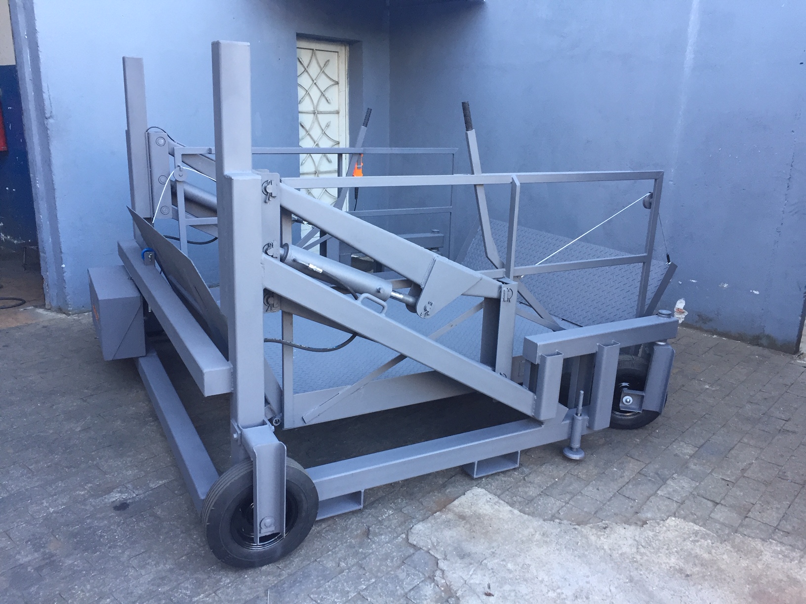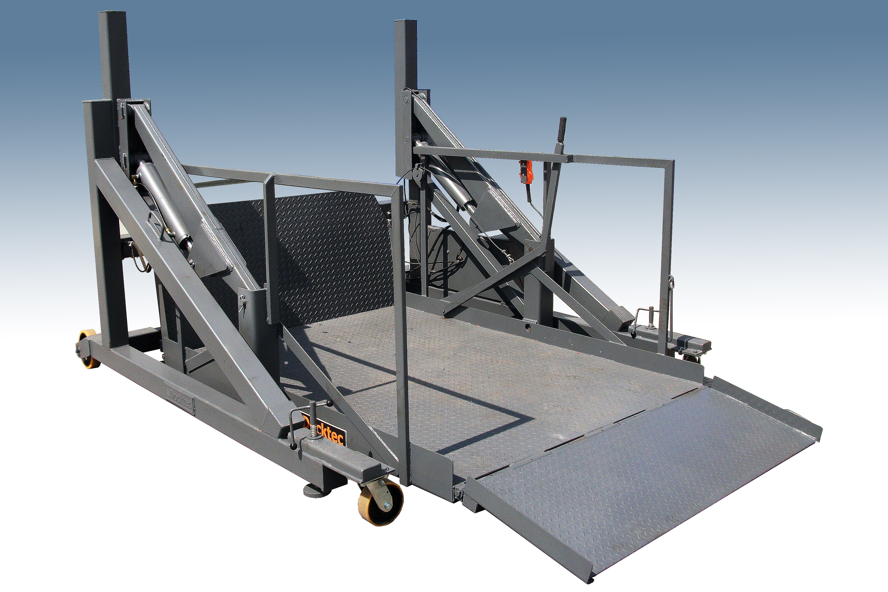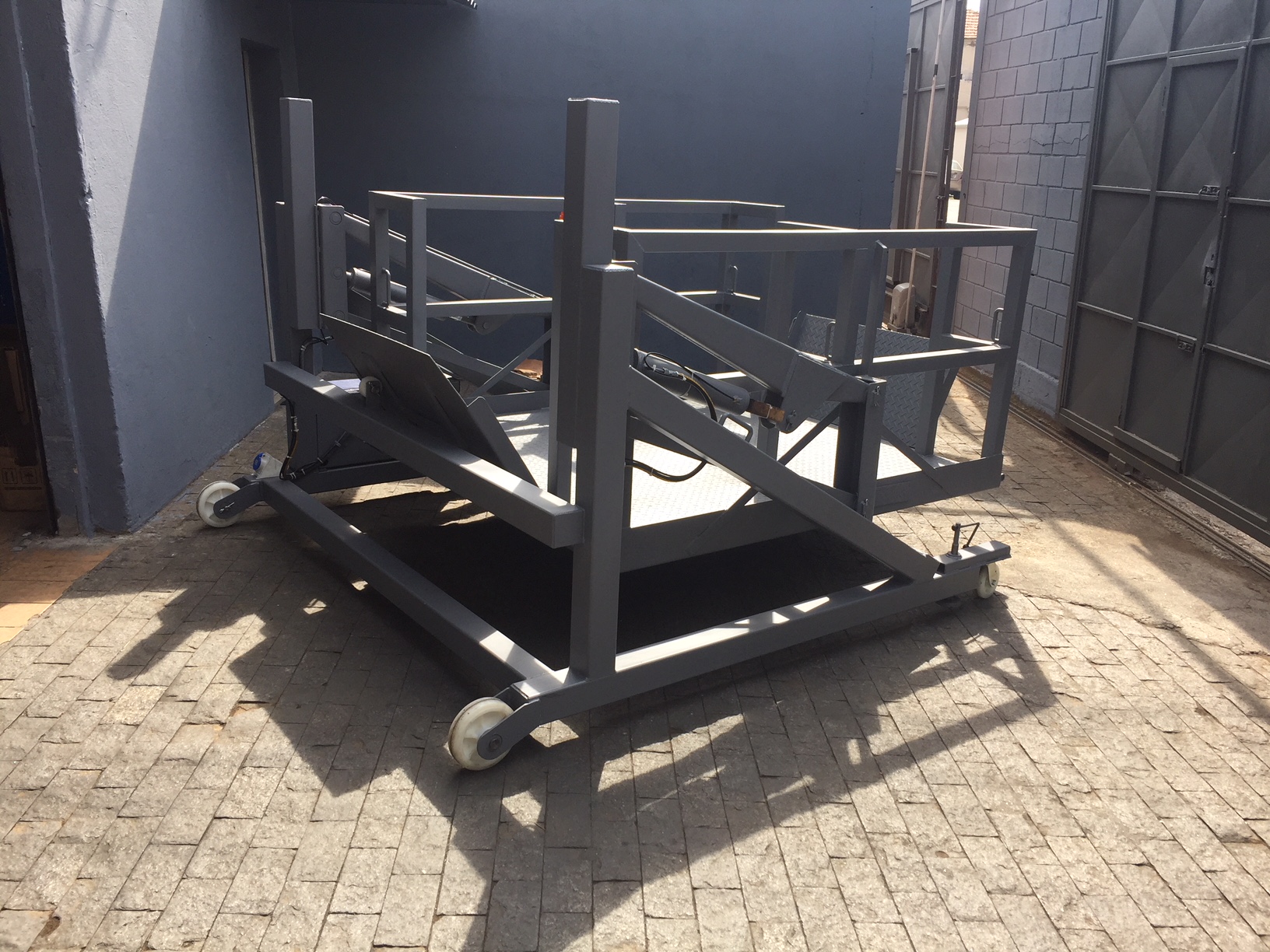 Funcionamento : através de 2 cilindros hidráulicos para a elevação, com basculamento manual para a rampa e a ponte , 2 niveladores manuais, para freio e nivelamento do equipamento. Deslocamento manual sem carga, dois rodízios giratórios e duas rodas fixas, revestidos com poliuretano.